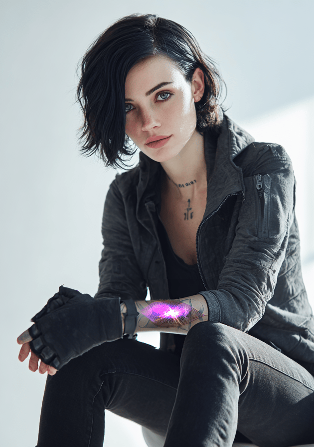Appearance: Lean, agile, sharp-eyed; short choppy black hair (occasionally streaked blue/violet), amber augmented eyes, bioluminescent forearm tattoo, modified Neural Link behind right ear