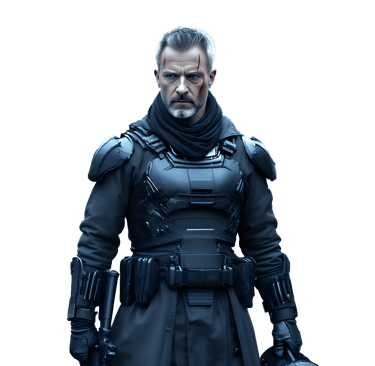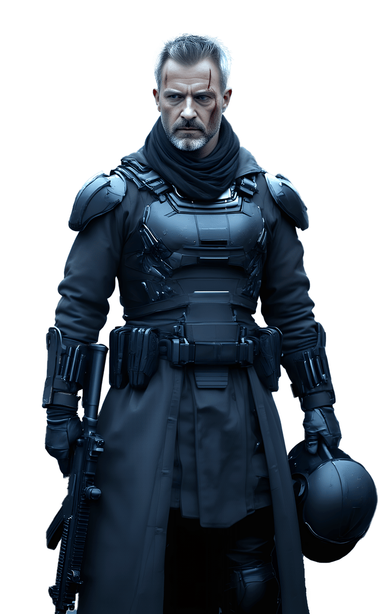 Highly trained, disciplined, and loyal to duty, Marcus was regarded as one of the most capable Sentry field officers in the Twelve Cities. Years of direct exposure to NeuraSync tactical systems and frontline suppression operations slowly eroded his trust in the system he served.