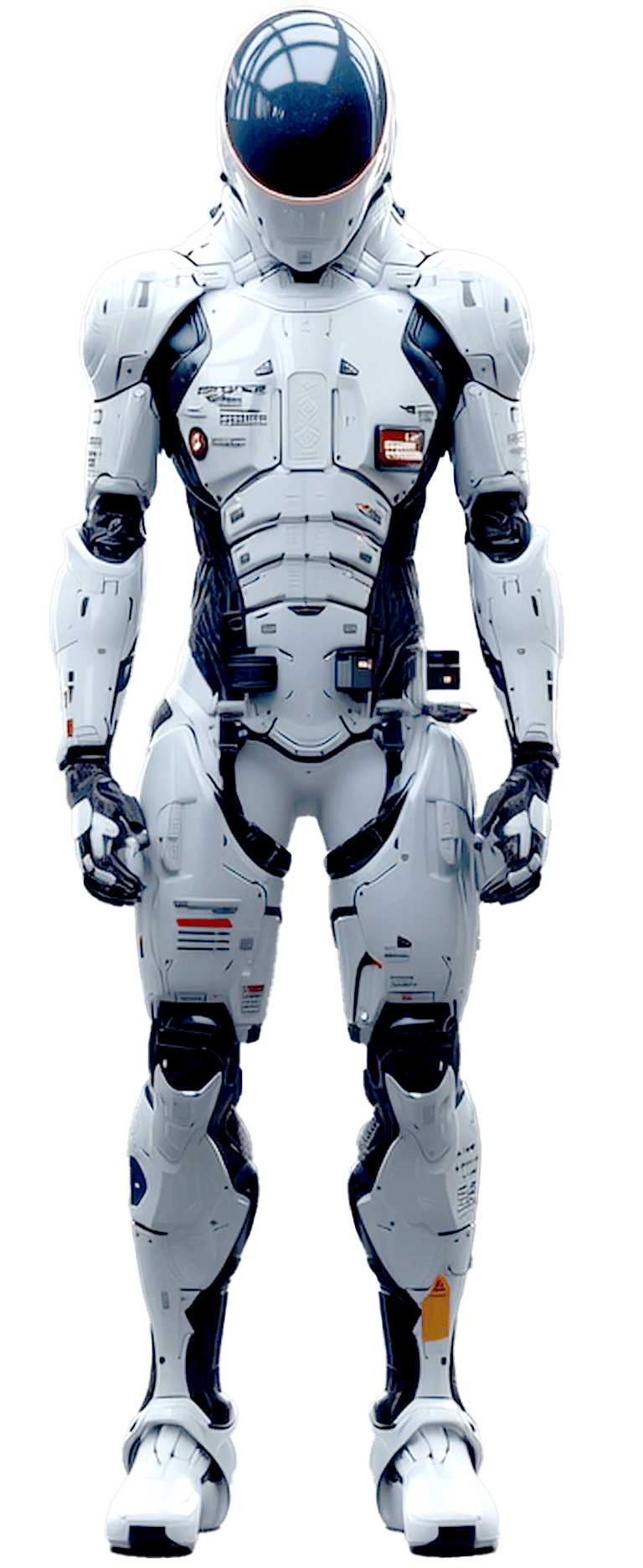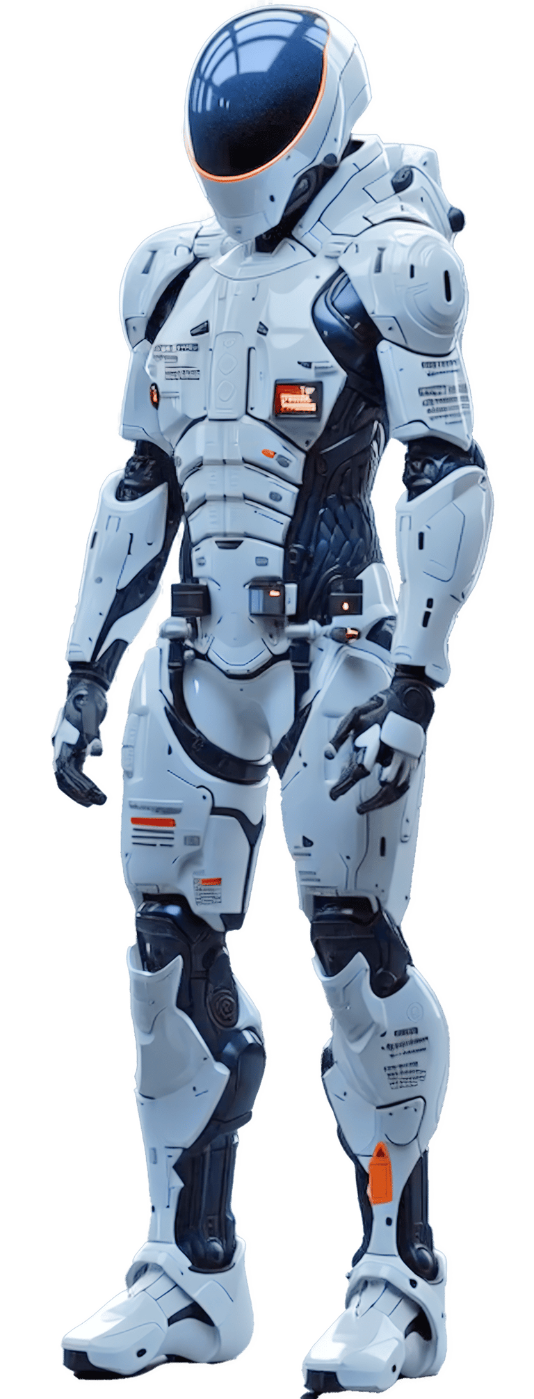 Faceplate: Seamless, opaque visor displaying subtle pulsing light when processing commands β mimicking empathy without expression.
